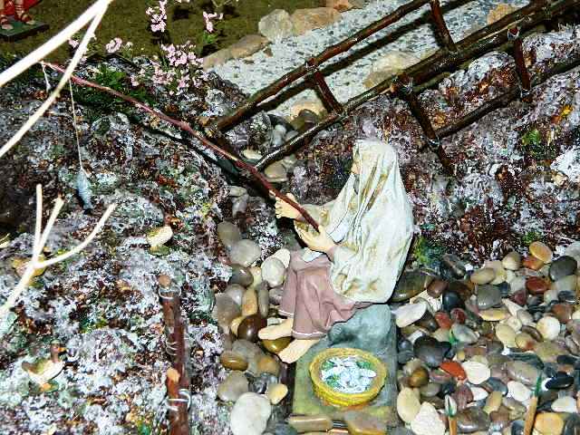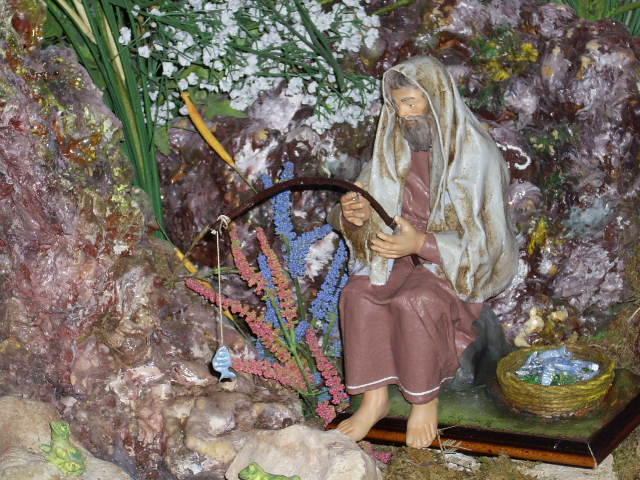 Grotta della Natività. Un piccolo gregge nei dintorni; un pastore inginocchiato ai piedi della culla; il secondo in piedi con il capo inchinato verso la Sacra Famiglia; il terzo in piedi, anch'egli in adorazione. Un venditore d'olio al frantoio ipogeo; un pastore davanti al falò con i suoi due gemellini; una pastorella davanti al falò ad arrostire dei pesci; un vecchio pastore è intento a pescare in una sorgente.