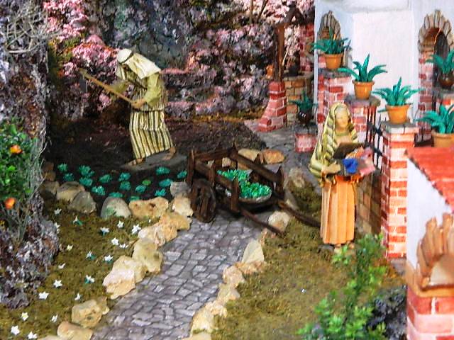La casa di Elisabetta e Zaccaria, nel villaggio collinare di Ain-Karim . Nel portico della casa si vede l'anziana cugina Elisabetta distesa su un letto con in braccia il figlioletto Giovanni che poppa; dietro di Lei, la cugina Maria, in ginocchio, che l'assiste con dei pannolini bianchi in mano. Anna, l'anziana madre di Maria, è nell'ingresso di casa, con un cofanetto di stoffe. Nei dintorni, in un campo coltivato, Zaccaria, il marito di Elisabetta, zappa la terra; al pozzo vi è un'ancella che attinge acqua. Da una finestra di casa si intravede il volto di un'ancella.