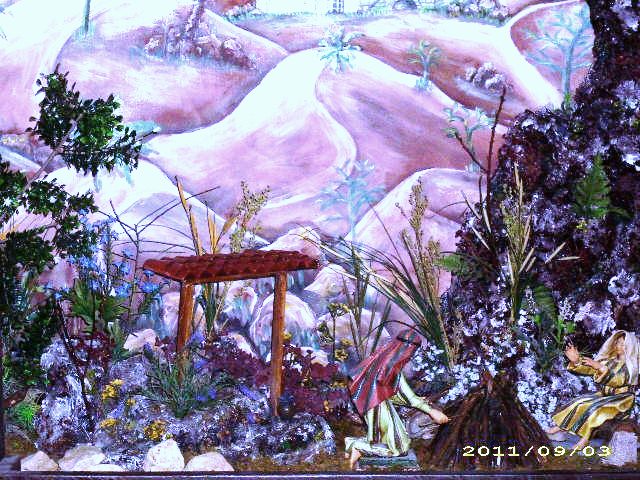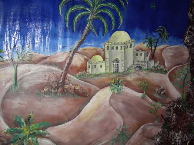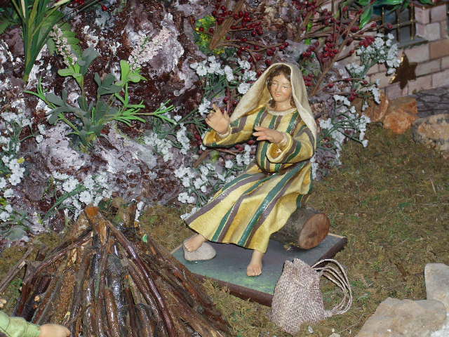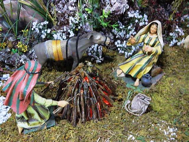 Un sentiero fra le colline, fra arbusti secchi e qualche grosso albero. Maria , incinta , è seduta sotto un albero a riscaldarsi; Giuseppe rinforza con sterpi il fuocherello; l'asinello è vicino a loro; per terra le un una borsa con le provviste. S'intravede il fiume Giordano e il deserto di Giuda.